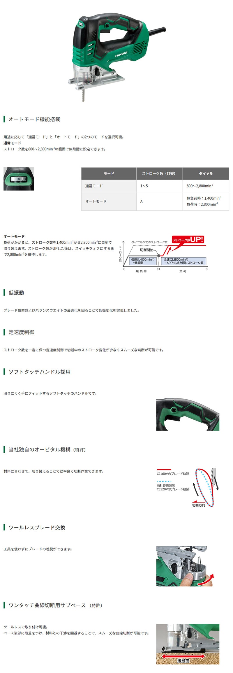HiKOKI CJ160V は、800 Wの高出力モーターとオートモード付き無段変速で、木材135 mm/軟鋼板10 mm の切断に対応する電子ジグソーです。定速制御と低振動設計により、直線切断から曲線切断まで安定した作業が可能。ソフトタッチハンドルやツールレス刃交換、曲線用サブベース付きで、DIYからプロの現場まで幅広く使える万能切断ツールです。