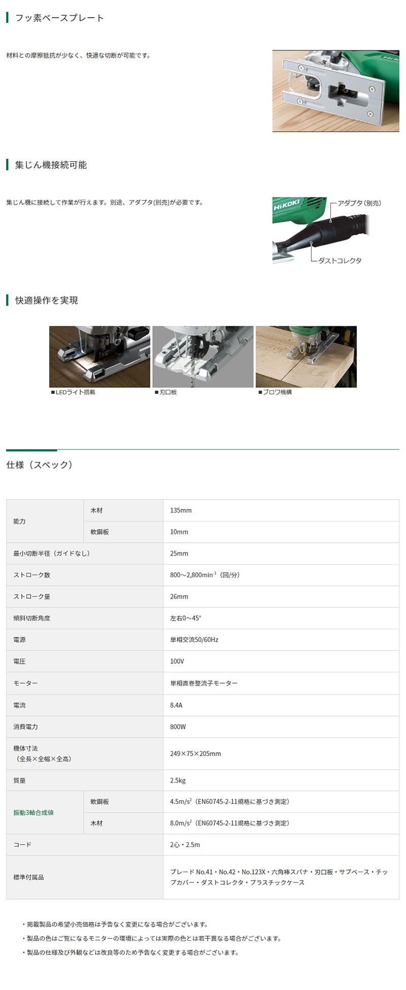 | 振動3軸合成値 | 木材 8.0 m/s? / 軟鋼板 4.5 m/s?(EN60745-2-11規格) |